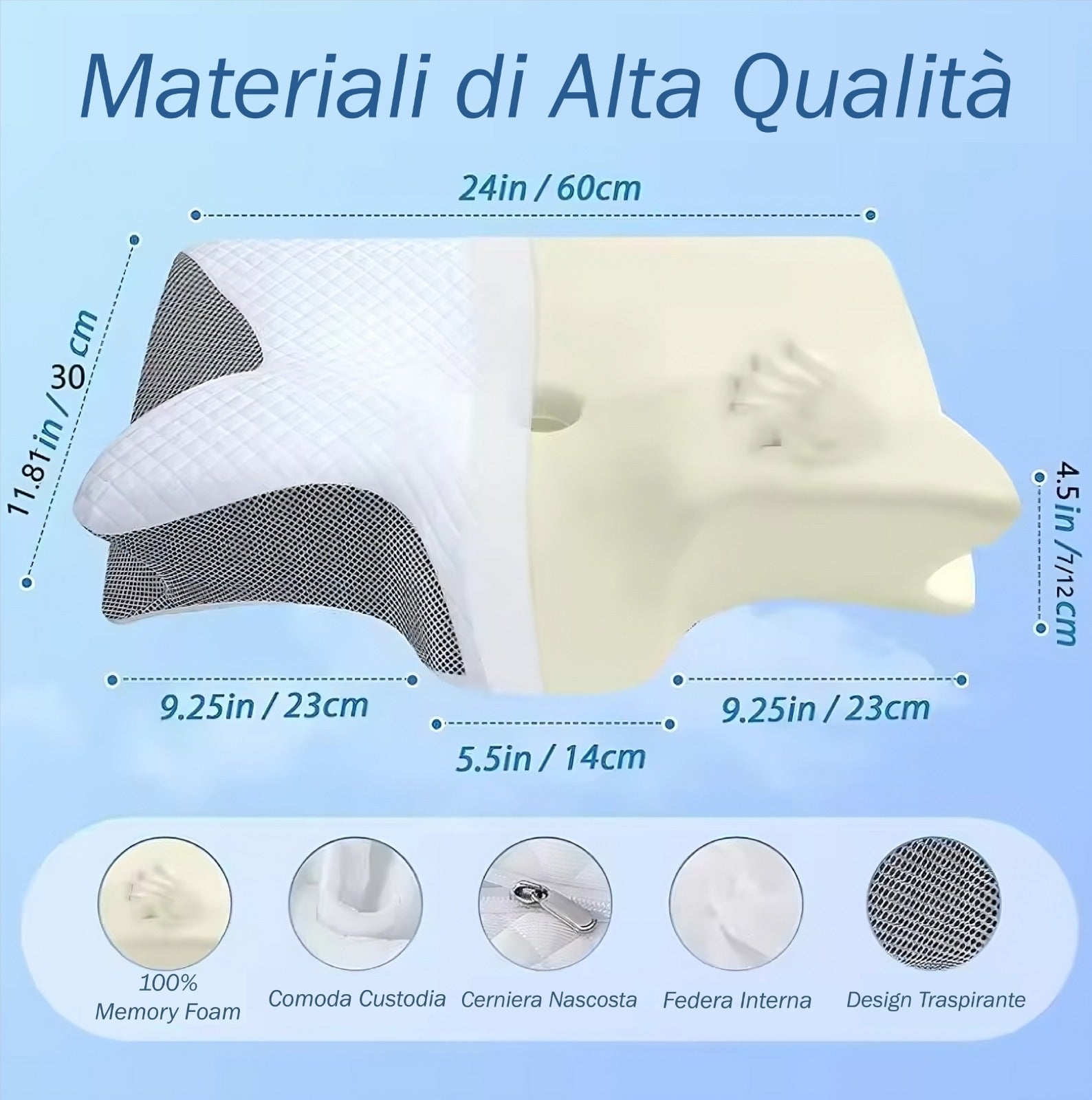 Con il nostro cuscino in memory foam cervicale puoi dire addio ai risvegli dolorosi e iniziare finalmente le tue giornate con energia. La sua forma ergonomica sostiene perfettamente testa e spalle, mantenendo la colonna vertebrale nella posizione ideale per tutta la notte.